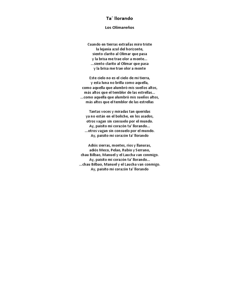 Los Olimareños Ta Llorando : Ay, paisito mi corazon ta' llorando otros vagan sin consuelo por el mundo. Los Olimareños Ta Llorando : D ya no estan en el boliche, en los asados, bm a otros vagan sin consuelo por el mundo.