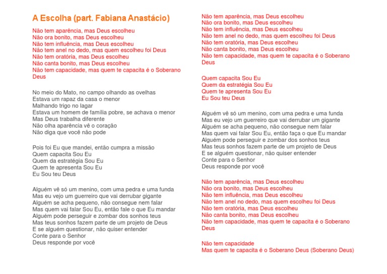 A Escolha Part Fabiana Anastacio Sandra Pires Letras Mus Br - Nao tem aparencia, mas deus escolheu nao ora bonito, mas deus escolheu nao tem influencia, mas deus escolheu nao tem anel no dedo mas quem escolheu foi deus!