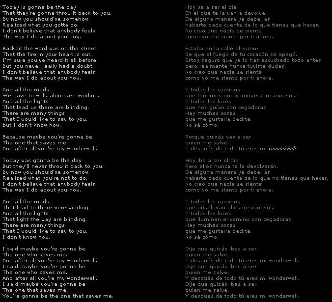 Wonderwall Letra Español - (2x) i said maybe you're gonna be the one that saves me and after all you're my wonderwall. Wonderwall Letra Español / Completa la letra escribiendo las palabras que faltan o seleccionando la opcion correcta.